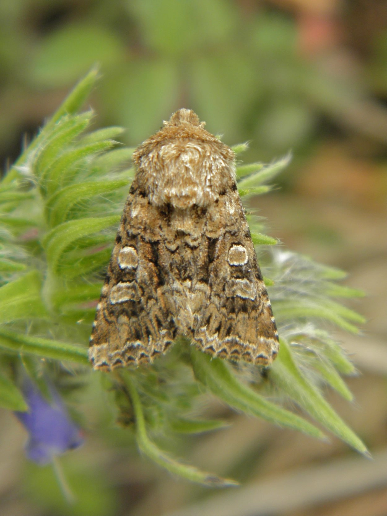 Voorvleugellengte: 13-15 mm. Een zeer variabele uil met een vaak bont geschakeerde tekening op de relatief brede voorvleugel; de rechte voorrand en de afgeronde achterrand van de vleugel vormen samen een vrij scherpe hoek. Vaste kenmerken zijn de pijlvlekken aan de binnenzijde van de golflijn en de donker omlijnde tapvlek in het middenveld. De grondkleur varieert van witachtig via strokleurig of geelachtig bruin tot matbruin. Lichte exemplaren zijn vaak tamelijk gelijkmatig gekleurd en meestal zwakker getekend dan donkere exemplaren. De meeste vlinders hebben echter een duidelijke tekening, waarin de normaal gevormde ringvlek en niervlek goed zichtbaar zijn. De achtervleugel is zandkleurig, bruinachtig of grijsachtig van kleur met een zwakke donkere zoom.