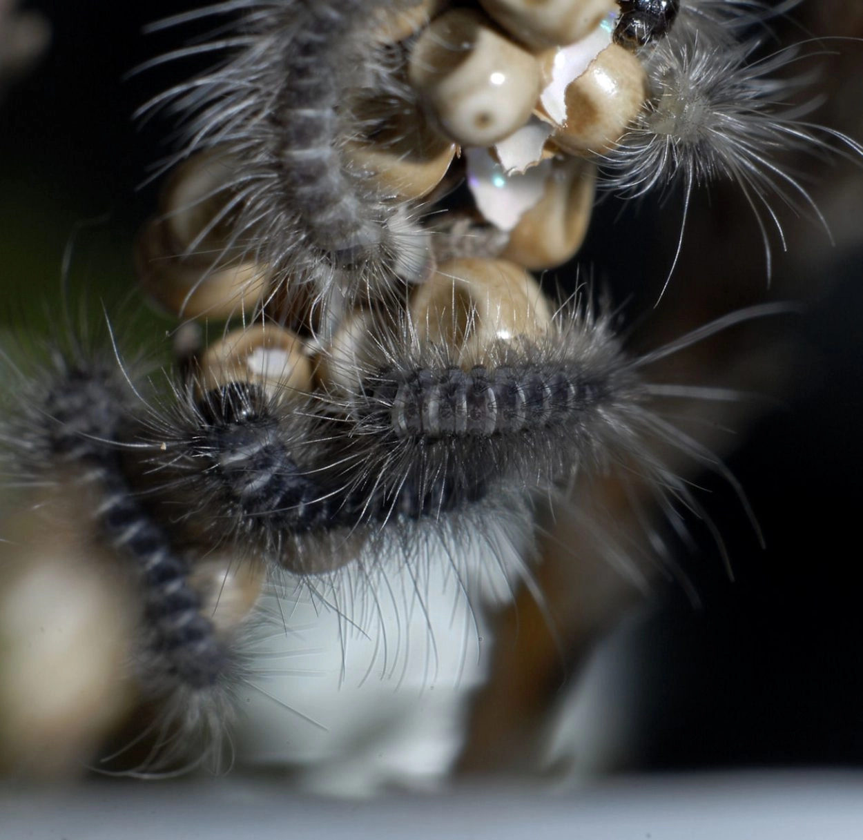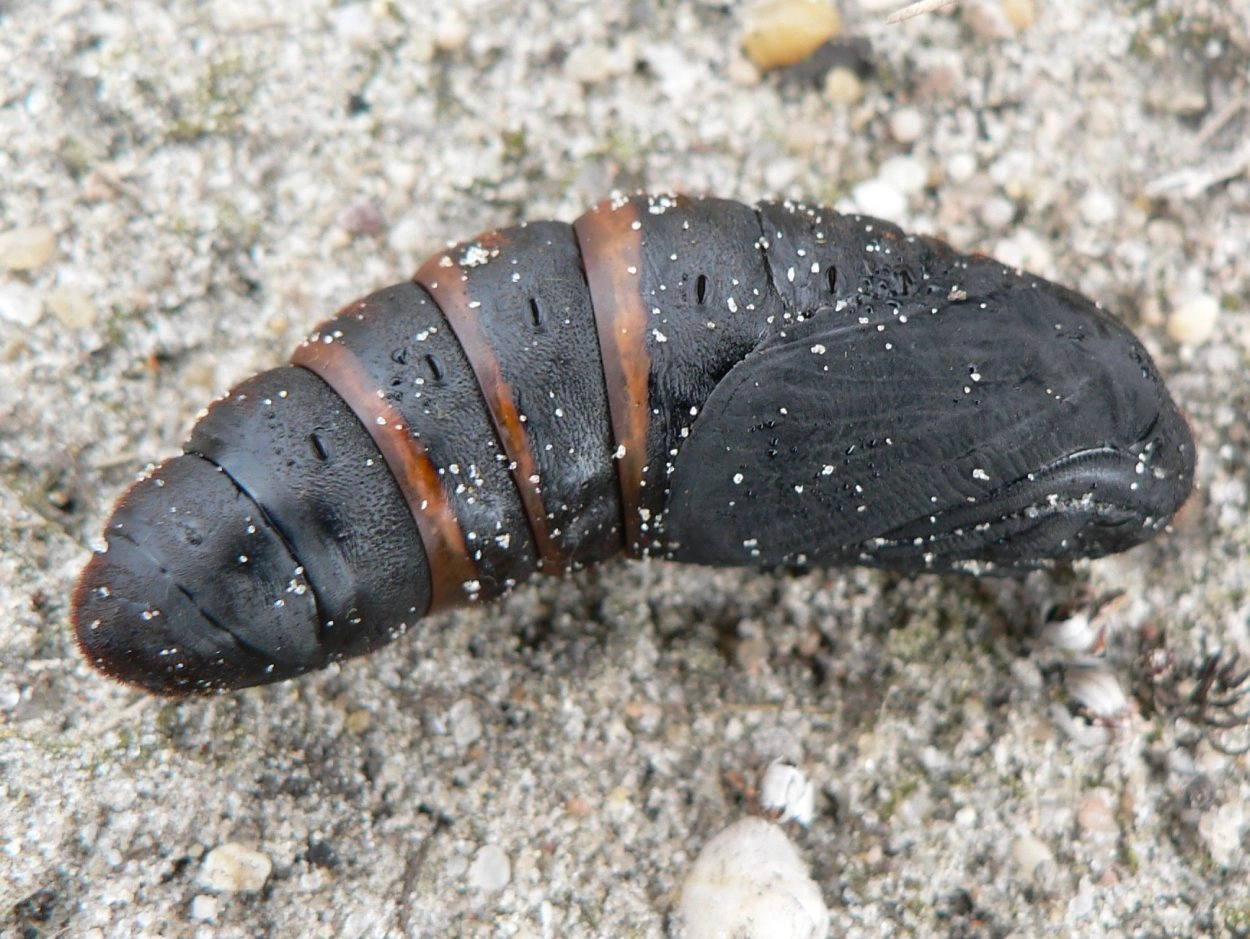Tot 65 mm; lichaam fluweelzwart, op de rug een dichte, roodachtig bruine beharing en grijsachtige haren op de flanken; kop zwart en bruinachtig behaard; de haren kunnen jeuk veroorzaken. De jonge rupsjes zijn zwartachtig bruin met op de rug lichtgele insnijdingen tussen de segmenten.