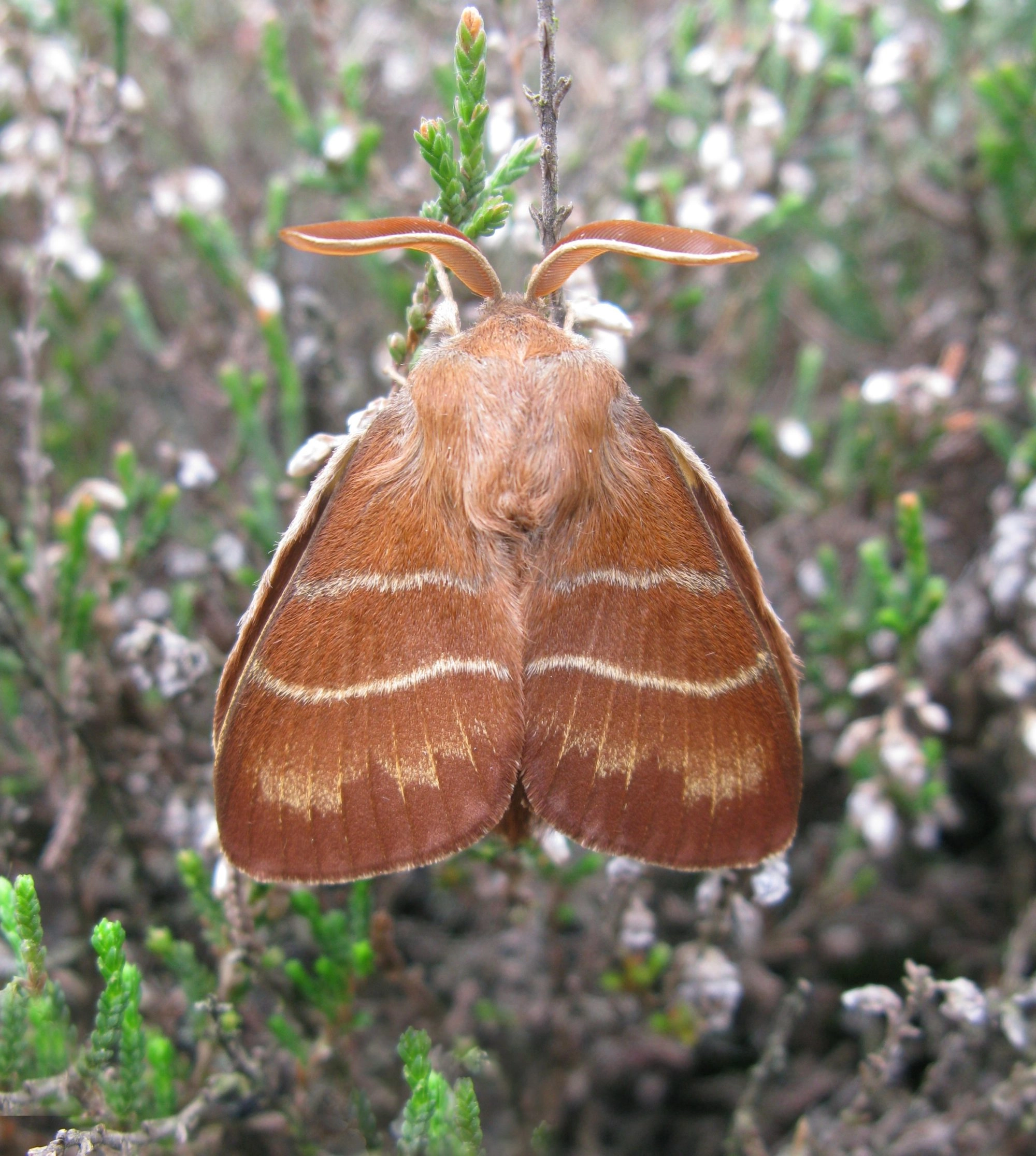 Voorvleugellengte: ♂ 22-26 mm, ♀ 26-31 mm. De combinatie van de grote afmetingen en de twee, min of meer parallel lopende, licht gekleurde centrale dwarslijnen op de voorvleugel maken deze spinner goed herkenbaar. Het mannetje is overwegend roodbruin; het grotere vrouwtje is grotendeels grijsbruin.