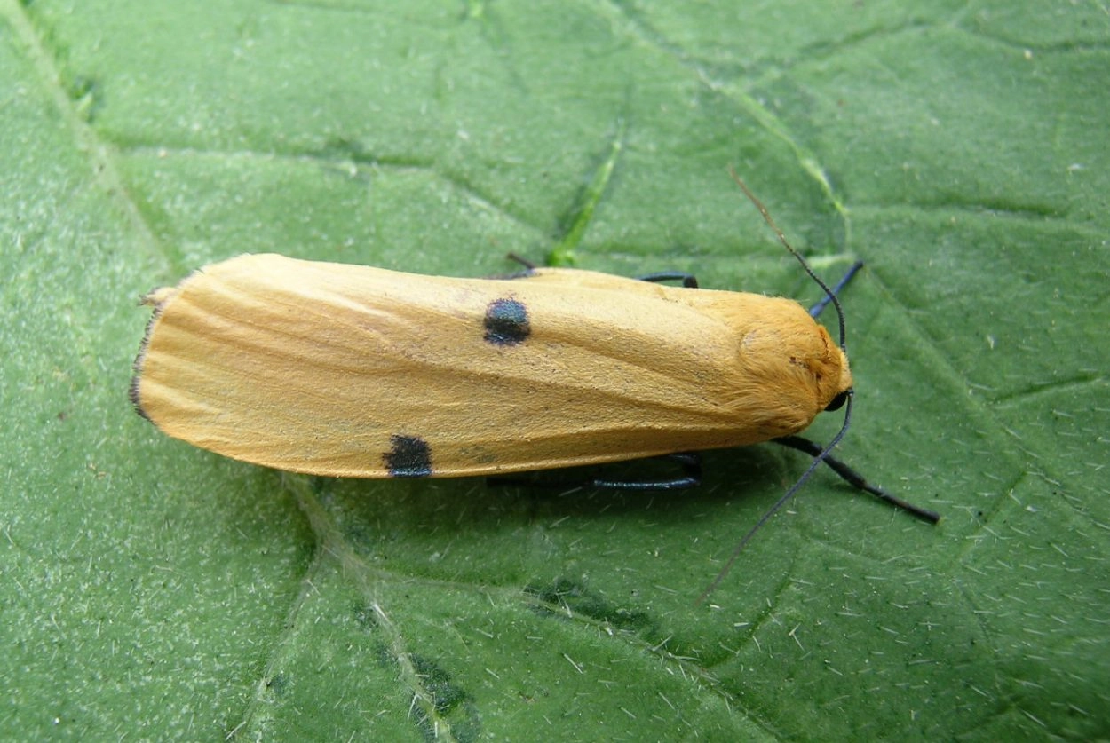 Voorvleugellengte: 18-22 mm. De grootste soort binnen de 'kleine beertjes'. Het vrouwtje heeft op de gele voorvleugel twee grote blauwzwarte stippen. Het mannetje heeft een zachtgrijze voorvleugel met een opvallend geel wortelveld en een blauwzwarte streep aan de basis van de voorrand. Ook de poten zijn volledig zwart met blauwachtige schijn.