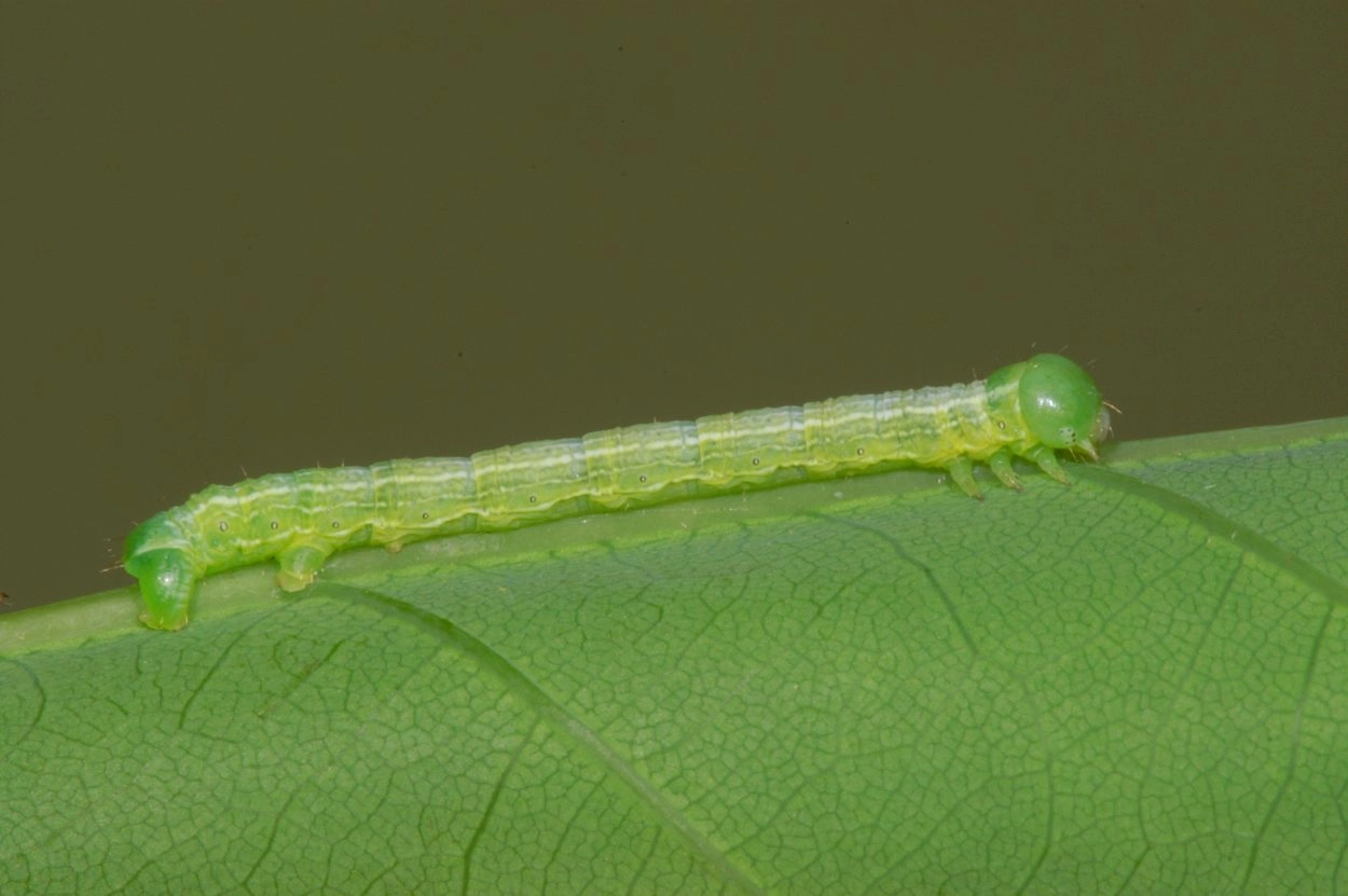 Tot 26 mm; heldergroen met een donkergroene lengtestreep over de rug en geelachtig witte lengtestrepen op beide flanken. Verschilt van de gewone spanrupsen door het bezit van een paar rudimentaire buikpoten aan segment acht.