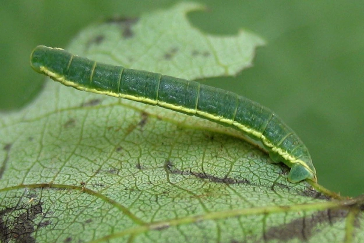 Tot 23 mm; lichaam blauwachtig groen met smalle witte ringen tussen de segmenten; onder de spiracula een brede, crèmekleurige lengtestreep; anaalsegment opvallend gepunt, ook crèmekleurig; kop grijsachtig groen.
