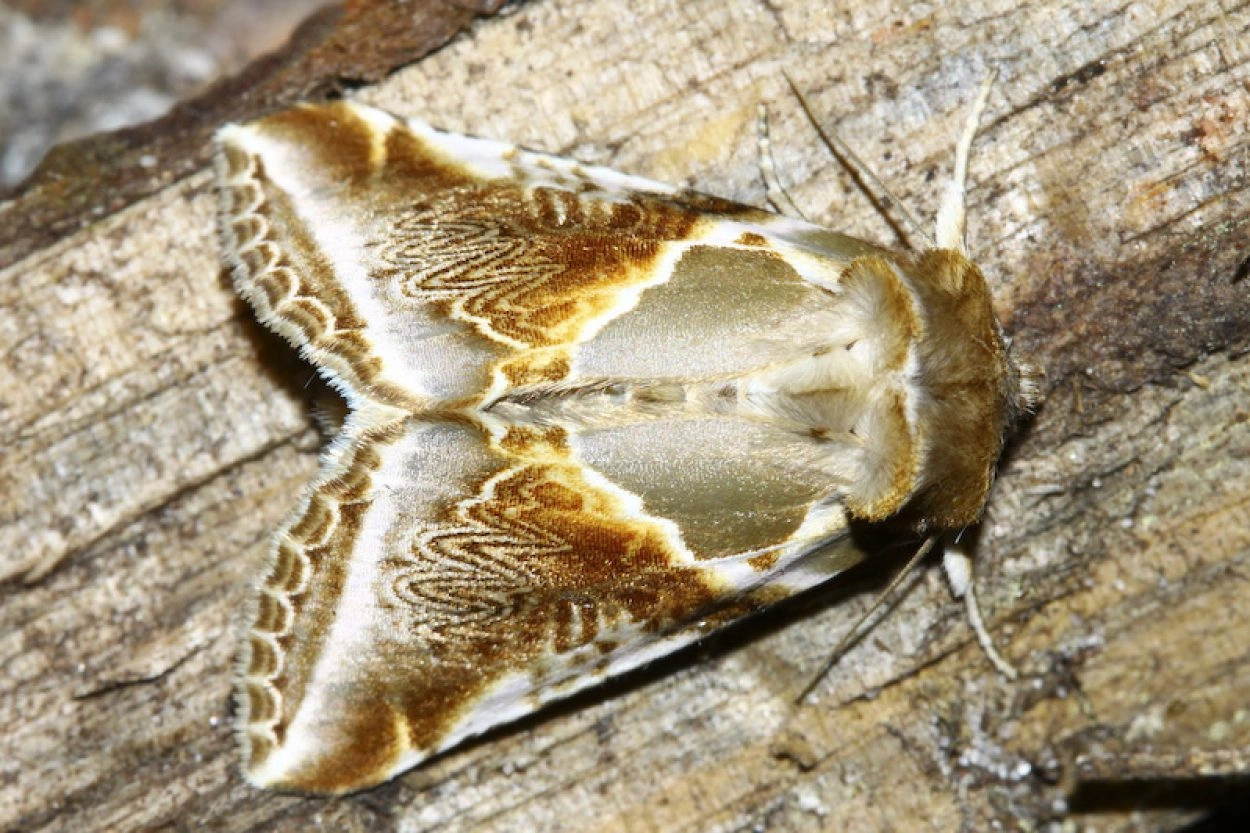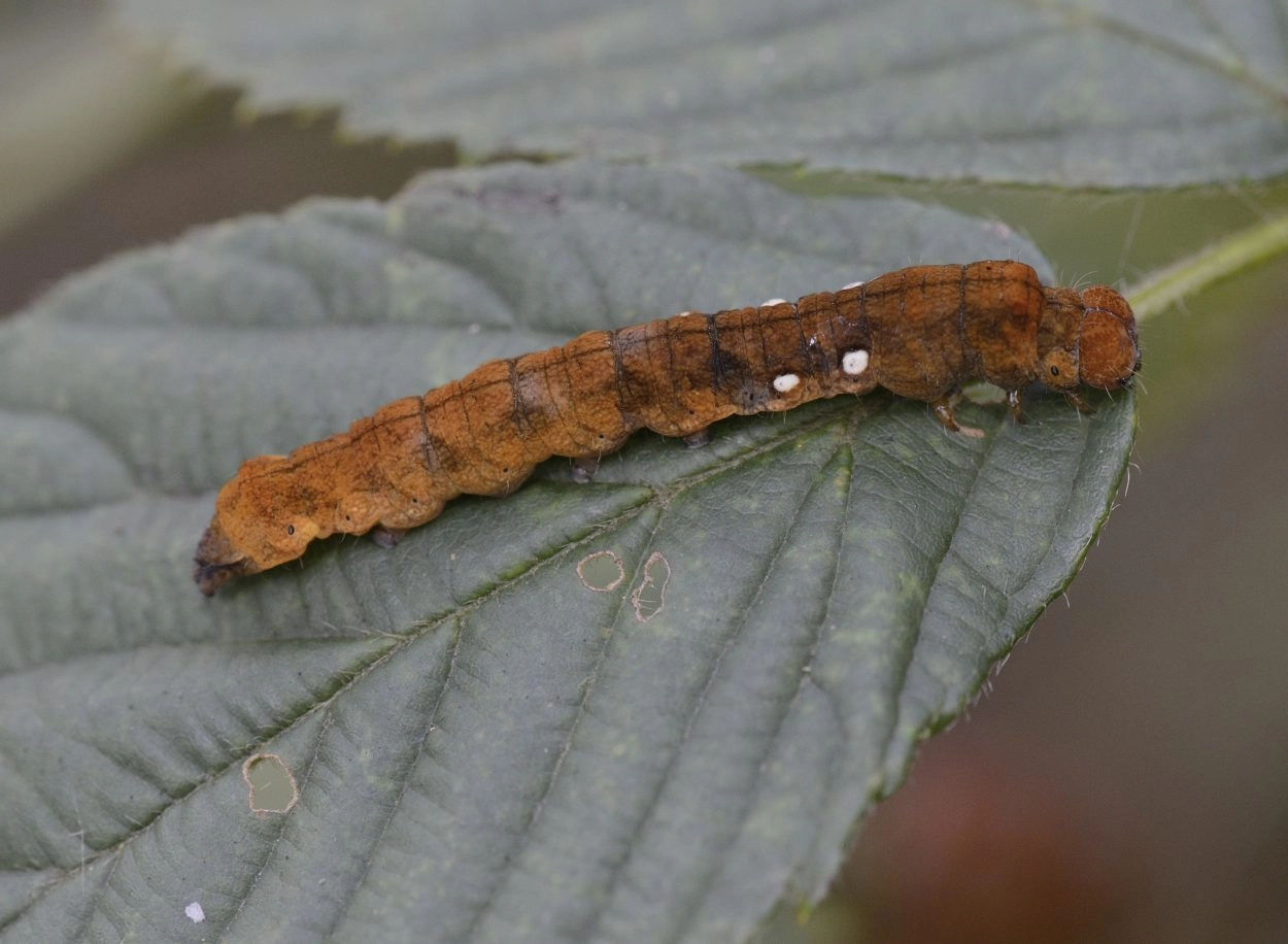 Tot 40 mm; lichaam kastanjebruin, met een netwerk van kleine zwartachtig bruine streepjes; insnijdingen tussen de segmenten zwart; een zwarte lengtestreep over het midden van de rug; aan weerszijden van segment vier een grote, witte vlek boven het spiraculum; kop roodachtig bruin.