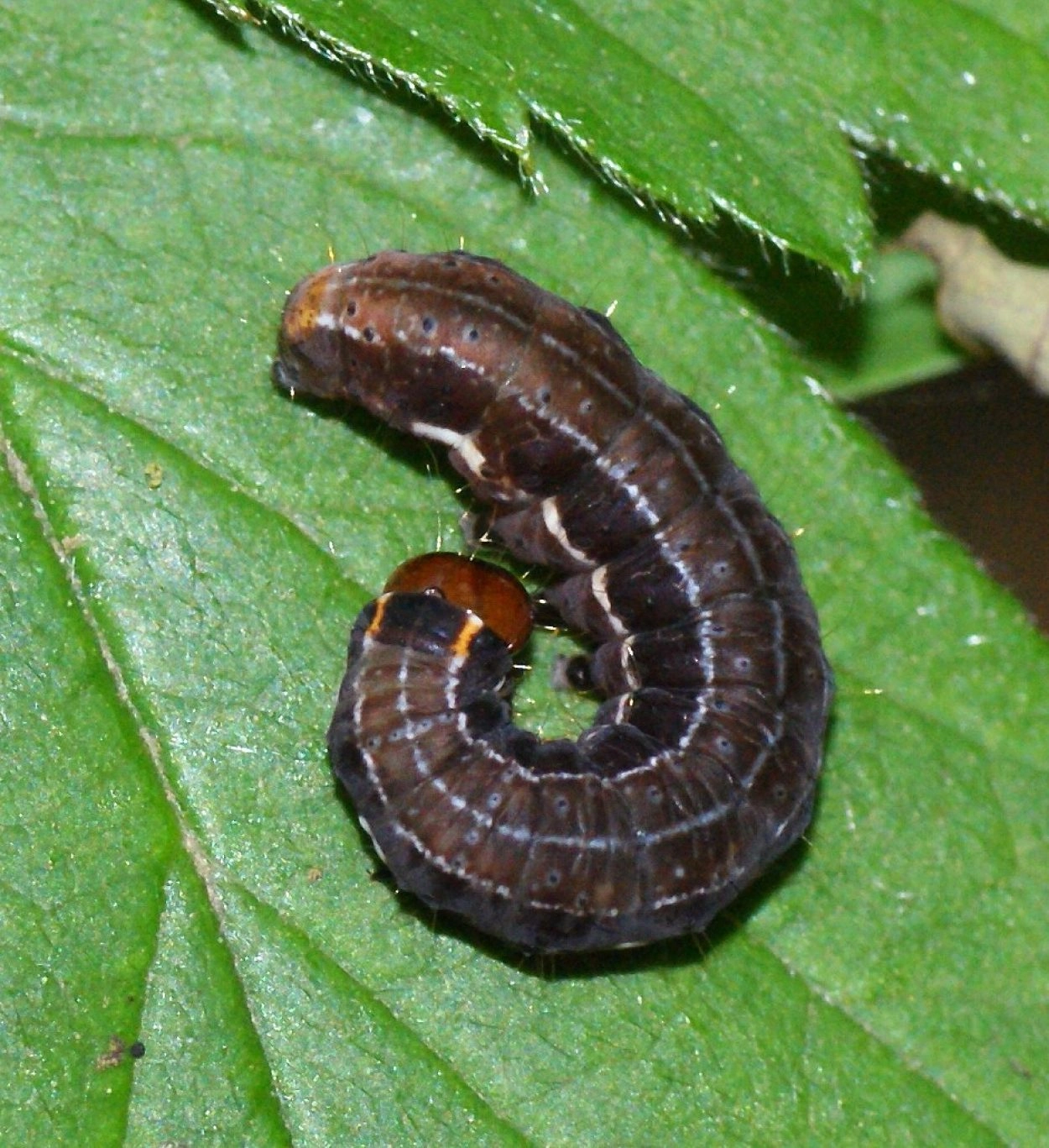 Tot 45 mm; lichaam fluweelachtig, bruinachtig zwart; onderzijde lichter grijsachtig bruin; over de rug drie fijne, grijze onduidelijke lengtestrepen; nekschild op segment één zwart met twee oranje lijntjes; over de spiracula een gebroken witte lengtestreep, die op de eerste vier segmenten en op het twaalfde segment verbreed is, waardoor grote witte vlekken worden gevormd; kop roodachtig bruin met zware, zwarte tekening.
