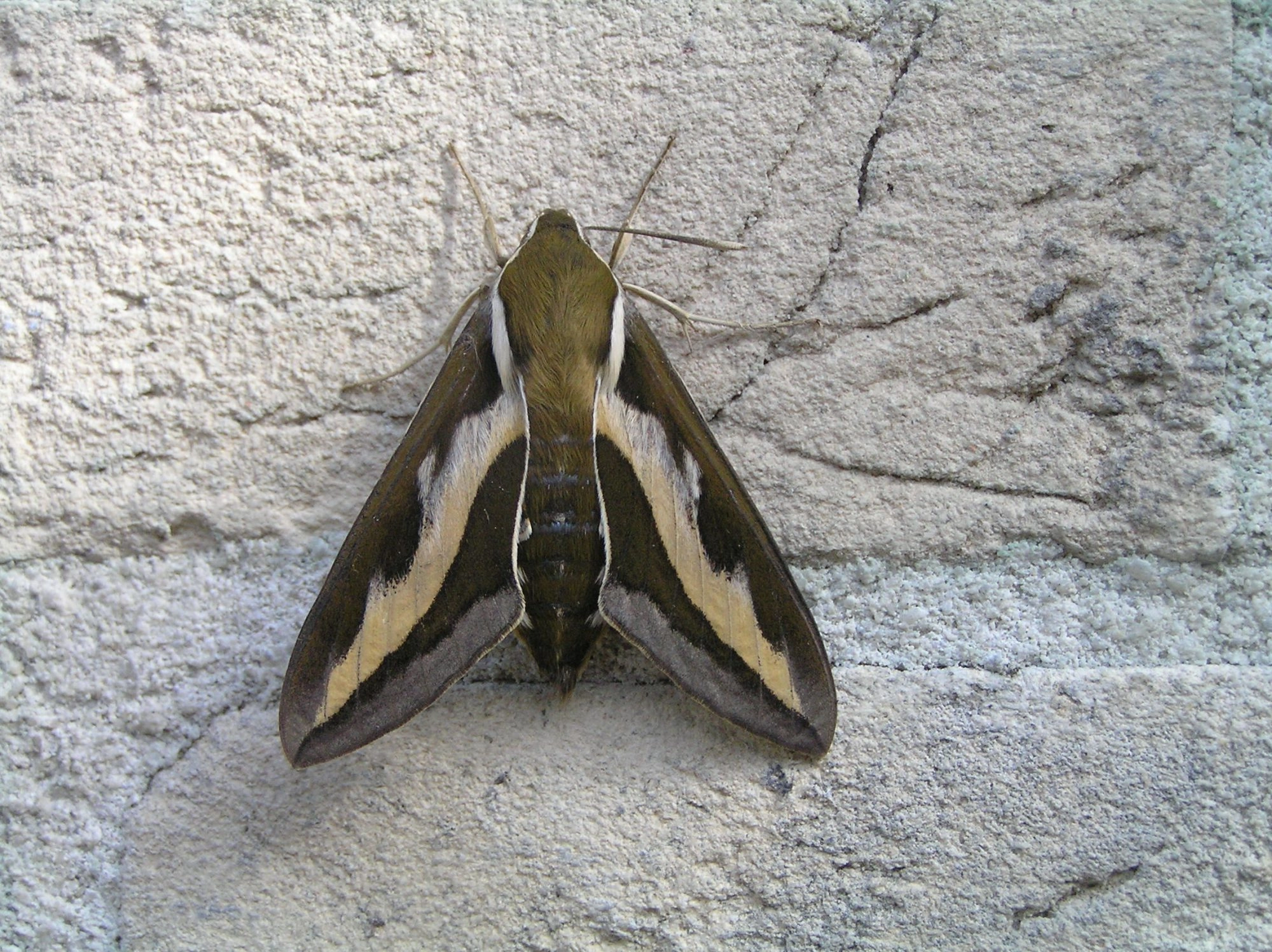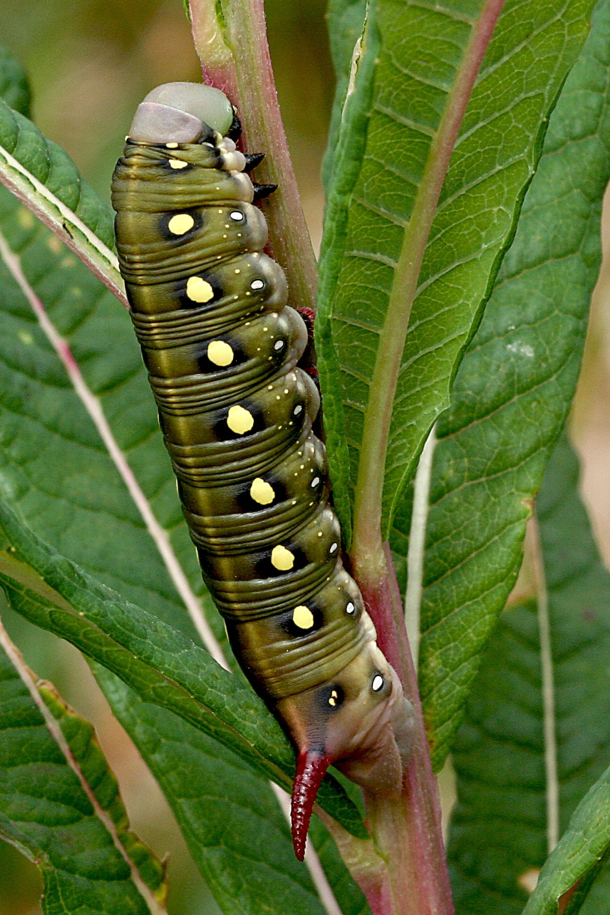 Tot 80 mm; lichaam varieert in kleur van olijfgroen tot bruin of donker purperachtig grijs, besprenkeld met fijne geelachtige vlekjes; op de flanken boven de spiracula een rij grote, ronde, gele of bleek geelachtig bruine vlekken; poten zwart; hoorn op segment elf roodachtig bruin, korrelig en met scherpe punt; kop roze. De jonge rupsen zijn groen