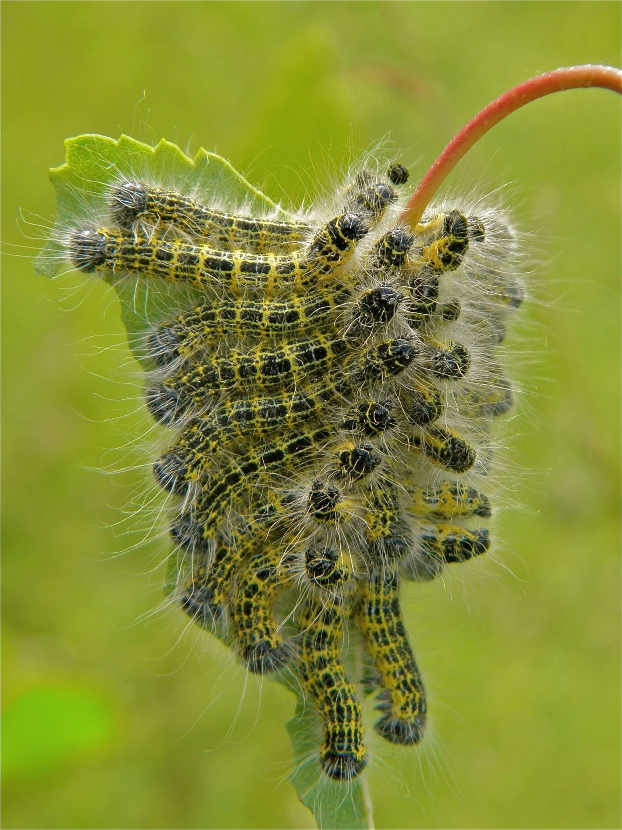 Tot 60 mm; overdekt met fijne wittte haartjes; lichaam glanzend oranje geel met brede zwarte lengtebanden over rug en flanken die door oranje en gele dwarsbanden worden gebroken.; kop zwart met een omgekeerde gele Y.