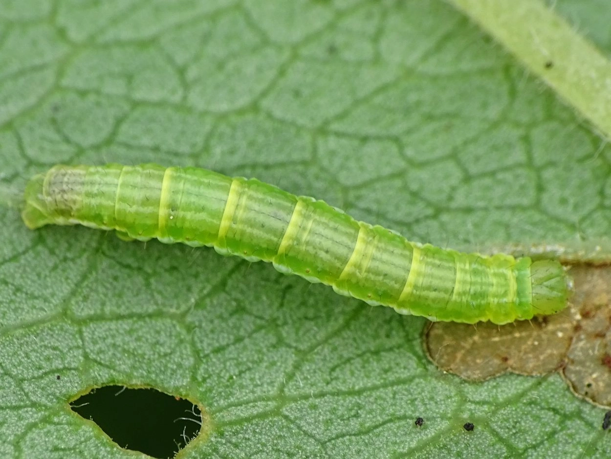 Pijlkruidspanner (Mesotype didymata).N.B.: vergelijk behalve de uiterlijke kenmerken ook de tijd van het jaar waarin de rupsen voorkomen, het habitat en de waardplant(en).