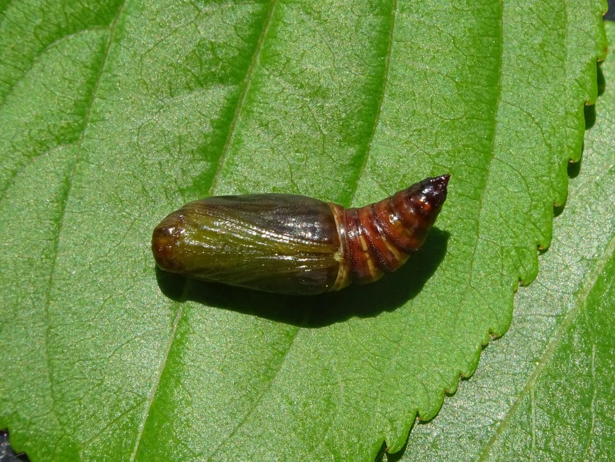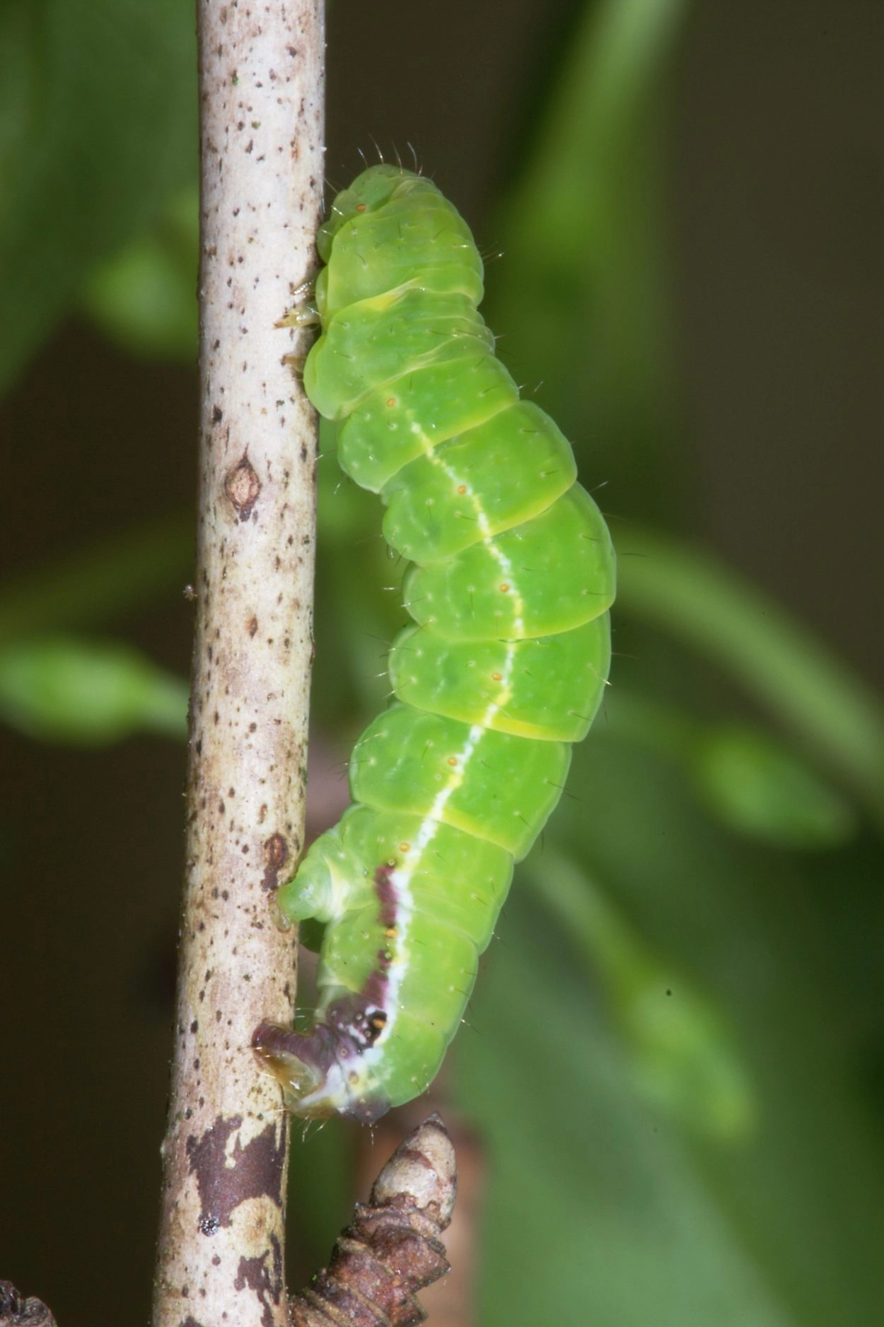 Tot 24 mm; lichaam groen met smalle, geelachtig groene ringen tussen de segmenten; over de rug een donkergroene lengtestreep en op de flanken een witte lengtestreep; spiracula roodachtig oranje; over het laatste spiraculum en de naschuiver een opvallende purperachtig bruine vlek; kop groen. Er is ook een grijsachtig witte vorm met een brede, purperachtig bruine middenstreep over de rug, donkere vlekken op de flanken en een grijsachtig bruine onderzijde; de kop is zwart.