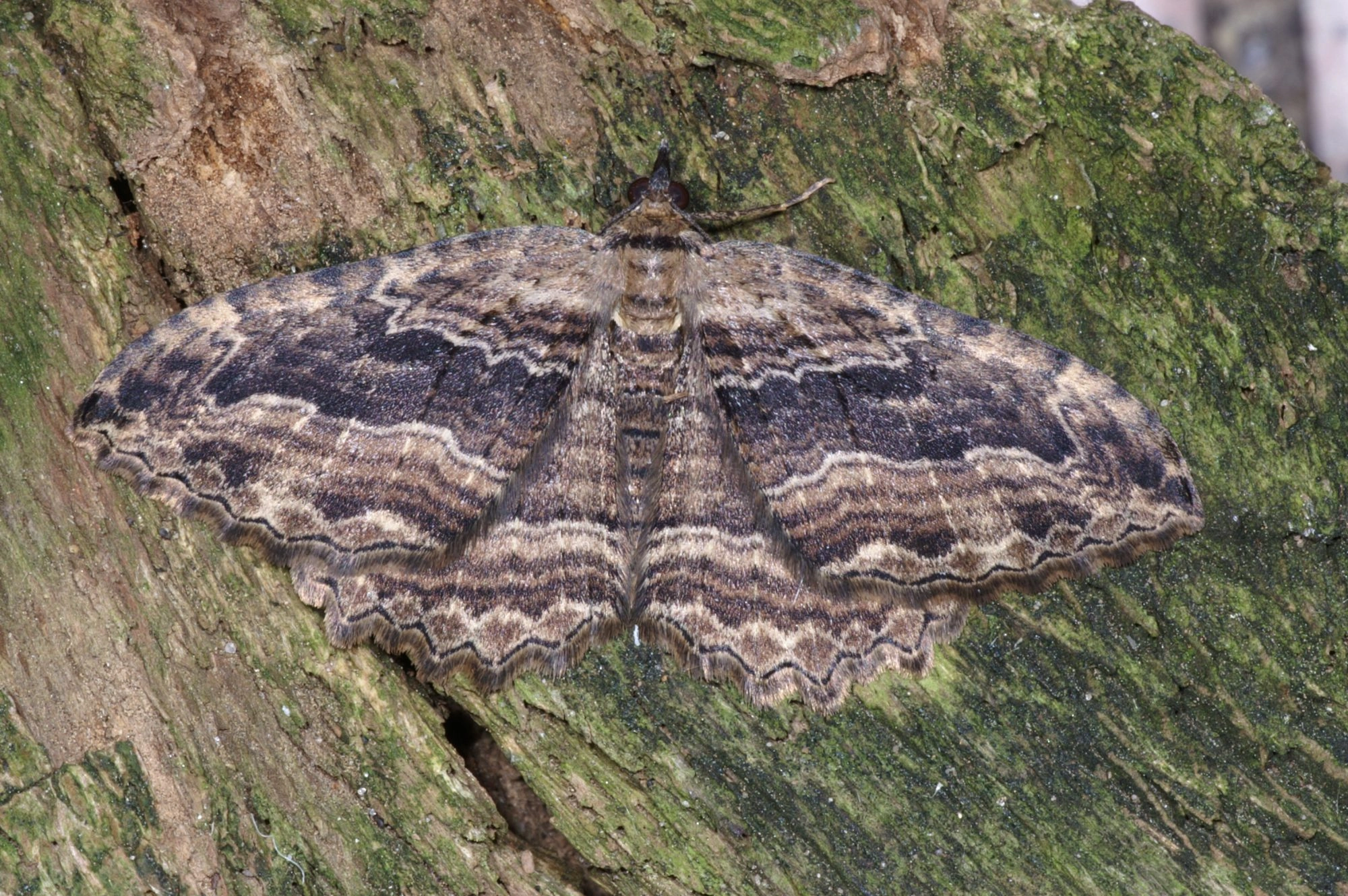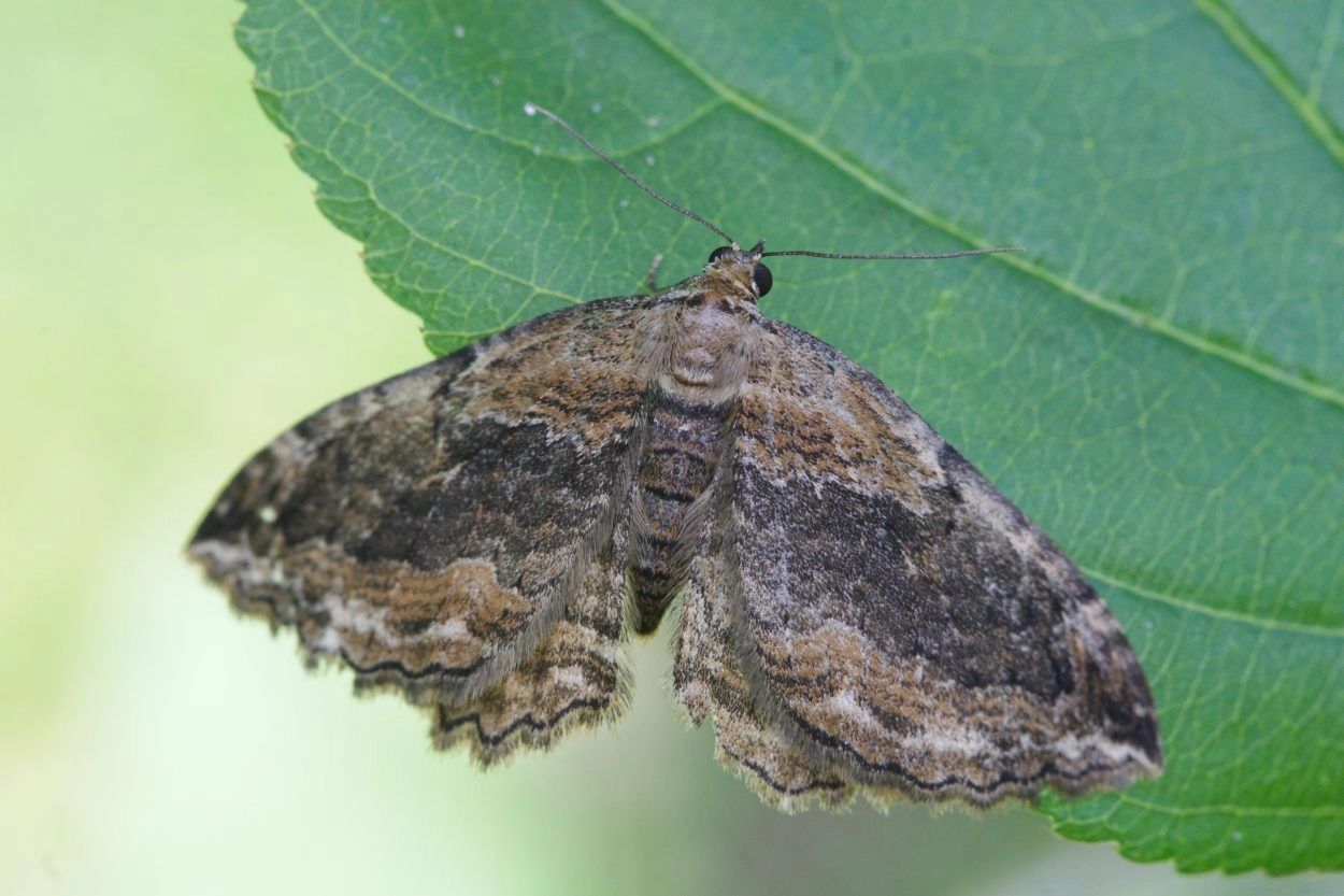 Voorvleugellengte: 17-20 mm. Een warmbruine, soms zeer donkere spanner met een brede, tamelijk spits toelopende voorvleugel. De donkere middenband is dicht bij de voorrand van de vleugel enigszins geknikt en het daardoor ontstane uitsteeksel aan de buitenzijde van de middenband heeft vaak een scherpe dubbele (W-vormige) punt. De achterrand van de vleugels is gekarteld, wat vooral bij de achtervleugel duidelijk te zien is. Zowel de kleur als de sterkte van de dwarslijnen kunnen aanzienlijk variëren.