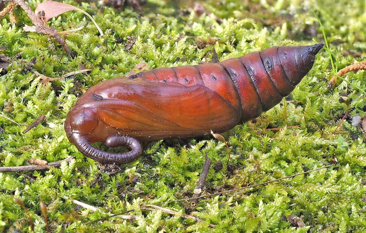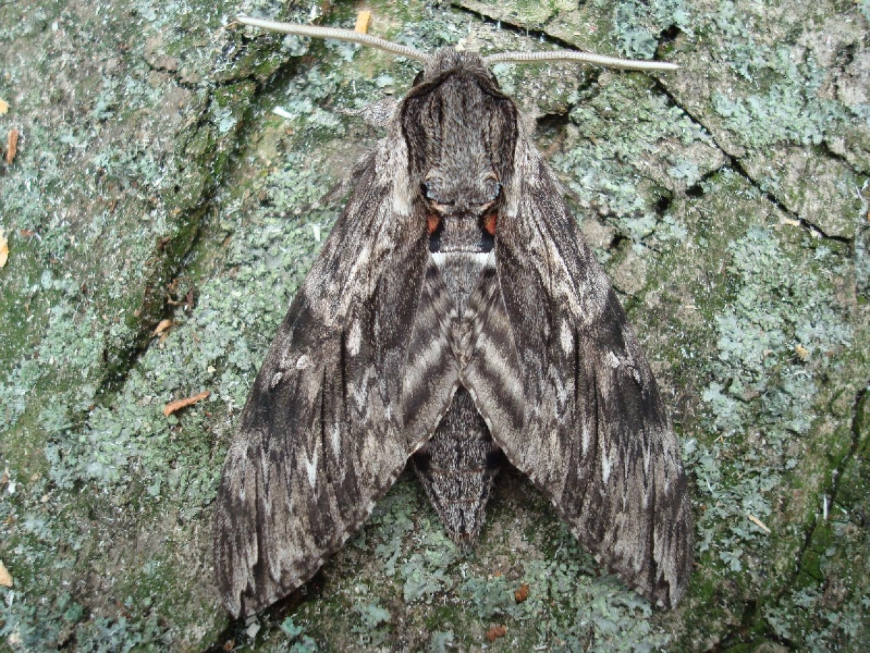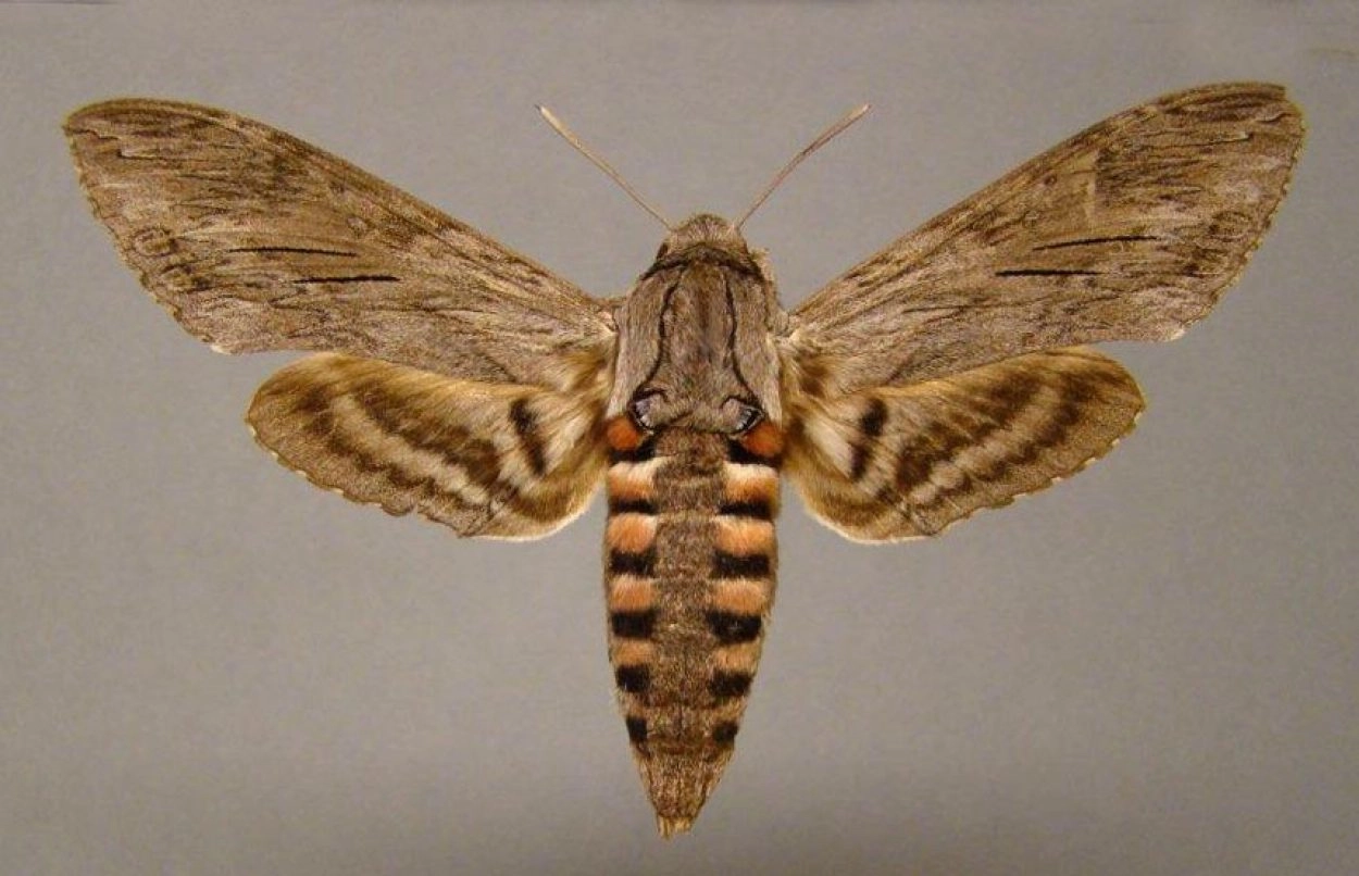 Tot 110 mm; zeer variabel in kleur en tekening, maar kan wel worden verdeeld in groene en bruine vormen; de groene vormen zijn helder groen met bruinachtige of zwartachtige schuine strepen op de flanken boven de spiracula; de bruine vormen hebben een zwartachtig of purperachtig bruin lichaam met lichtbruine of rozeachtige schuine strepen; spiracula zwart; de hoorn op het elfde segment rood of geelachtig met zwart uiteinde; kop roodachtig bruin of licht okerkleurig, met zwarte strepen.