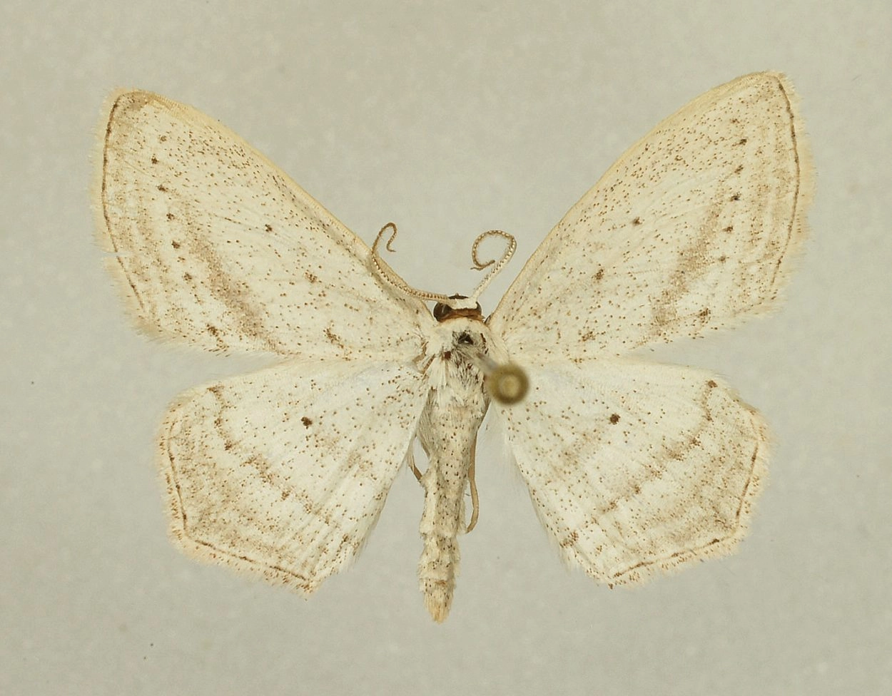 Voorvleugellengte: 11-13 mm. De melkwitte vleugels hebben vaak een zachtroze tint en zijn fijn bespikkeld met donkere schubben. Van de binnenste dwarslijn is meestal niet meer zichtbaar dan een aantal stippen op de binnenste helft van de vleugel; soms zijn ze afwezig. De buitenste dwarslijn bestaat uit een aaneengesloten rij kleine stippen. De middelste dwarslijn is breed, vaak meer een middenschaduw, en loopt vrij recht in de richting van de vleugelpunt, maar vervaagt meestal voordat deze bereikt is. Op zowel de voor- als de achtervleugel bevindt zich een middenstip. De achterrand van de achtervleugel heeft een kleine maar duidelijke punt. De intensiteit van de tekening kan enigszins variëren.