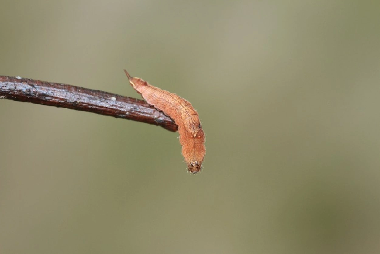 Tot 12 mm; plomp in het midden, abrupt versmald naar de kop en geleidelijk naar de zwartgespikkelde staart; lichaam roodachtig bruin, fijn getekend met een netwerk van donkerbruine of zwartachtige streepjes; over de rug een donkerbruine middenstreep, die naar de staart in een brede bleek witachtig bruine band overgaat; segment twee en drie gezwollen, elk met twee kleine puntige wratjes op de rugzijde; kop lichtbruin met zwartachtige vlekjes.