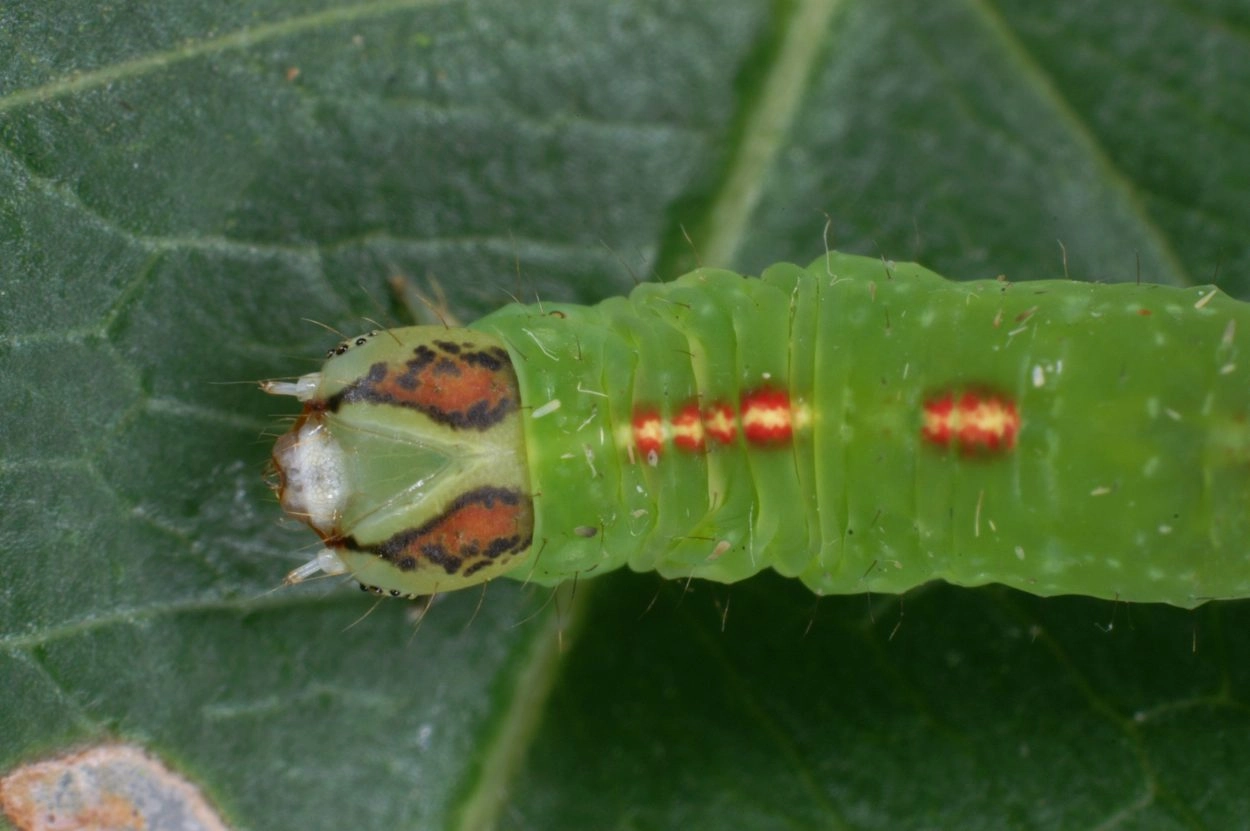 Tot 26 mm; lichaam blauwachtig groen aan de bovenzijde en witachtig groen aan de onderzijde, op de rug gewoonlijk een rij bruingeringde, roodachtige vlekken, maar deze kunnen ook vervangen zijn door een gebroken, roodachtig bruine lengtestreep met aan weerszijden witte stippen; kop groen met twee roodachtig bruine vlekken.