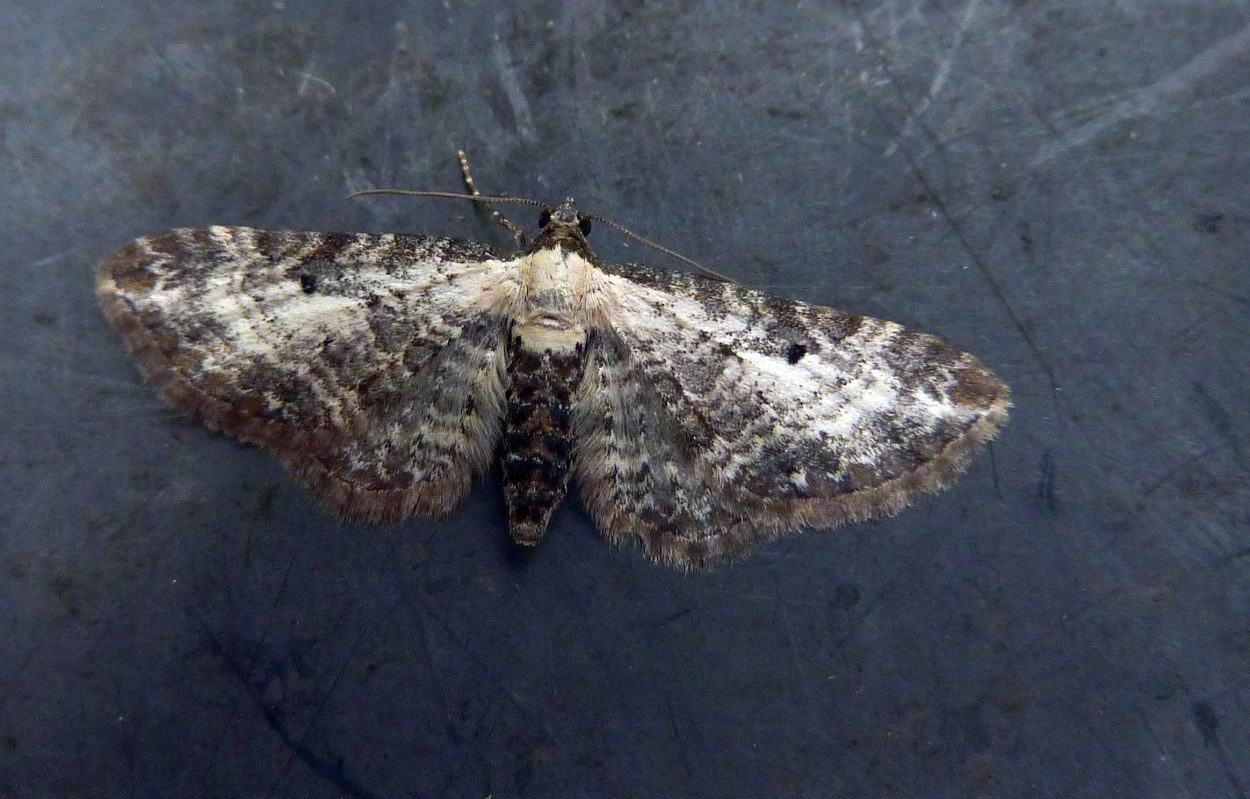 Voorvleugellengte: 12-13 mm. Goed te herkennen aan het grote witte veld op de voorvleugel met de duidelijke zwarte middenstip; de randen van de voorvleugel zijn grijsachtig bruin. Deze kleurencombinatie resulteert in een zeer karakteristiek beeld. De vlinders kunnen nogal variëren in contrast en zijn soms sterk donker bestoven, maar altijd blijft in het midden van de vleugel een wit of lichtgrijs gedeelte zichtbaar en zijn de vleugelranden donkerder.