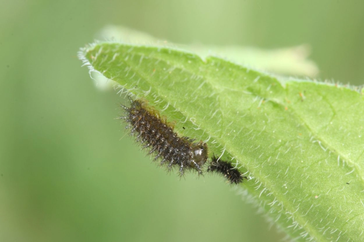Tot 25 mm; lichaam zwart met een rij witte vlekjes langs de spiracula; de doorns op de rug variëren in kleur van zwart tot geel of wit; kop zwart.