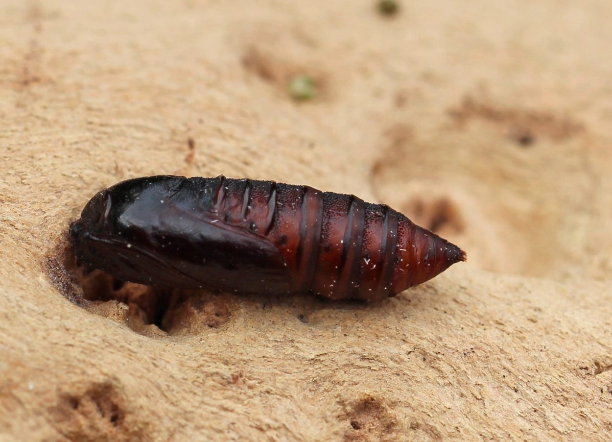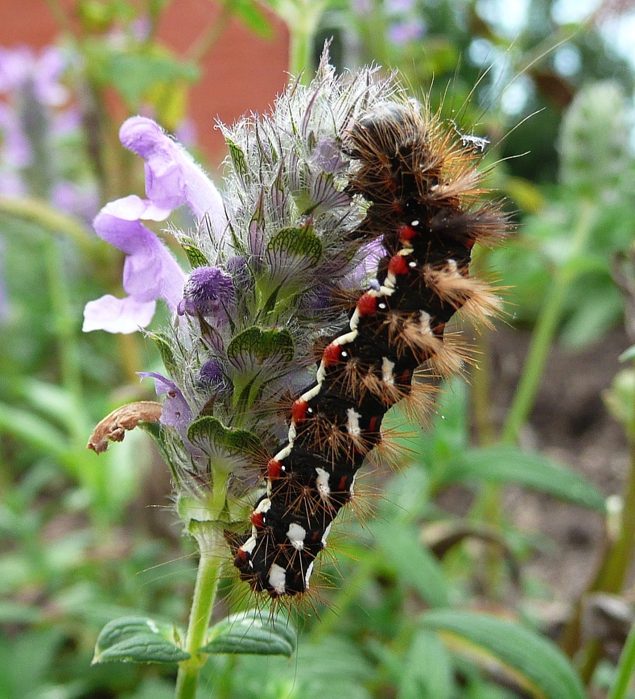 Tot 38 mm; lichaam zwart met roodachtig bruine haarborstels; over het midden van de rug een rij rode vlekjes met aan weerszijden een rij grotere, witte vlekken; onder de lijn van de witte spiracula een band van rode en oranje vlekken; kop zwart met bruine tekening.