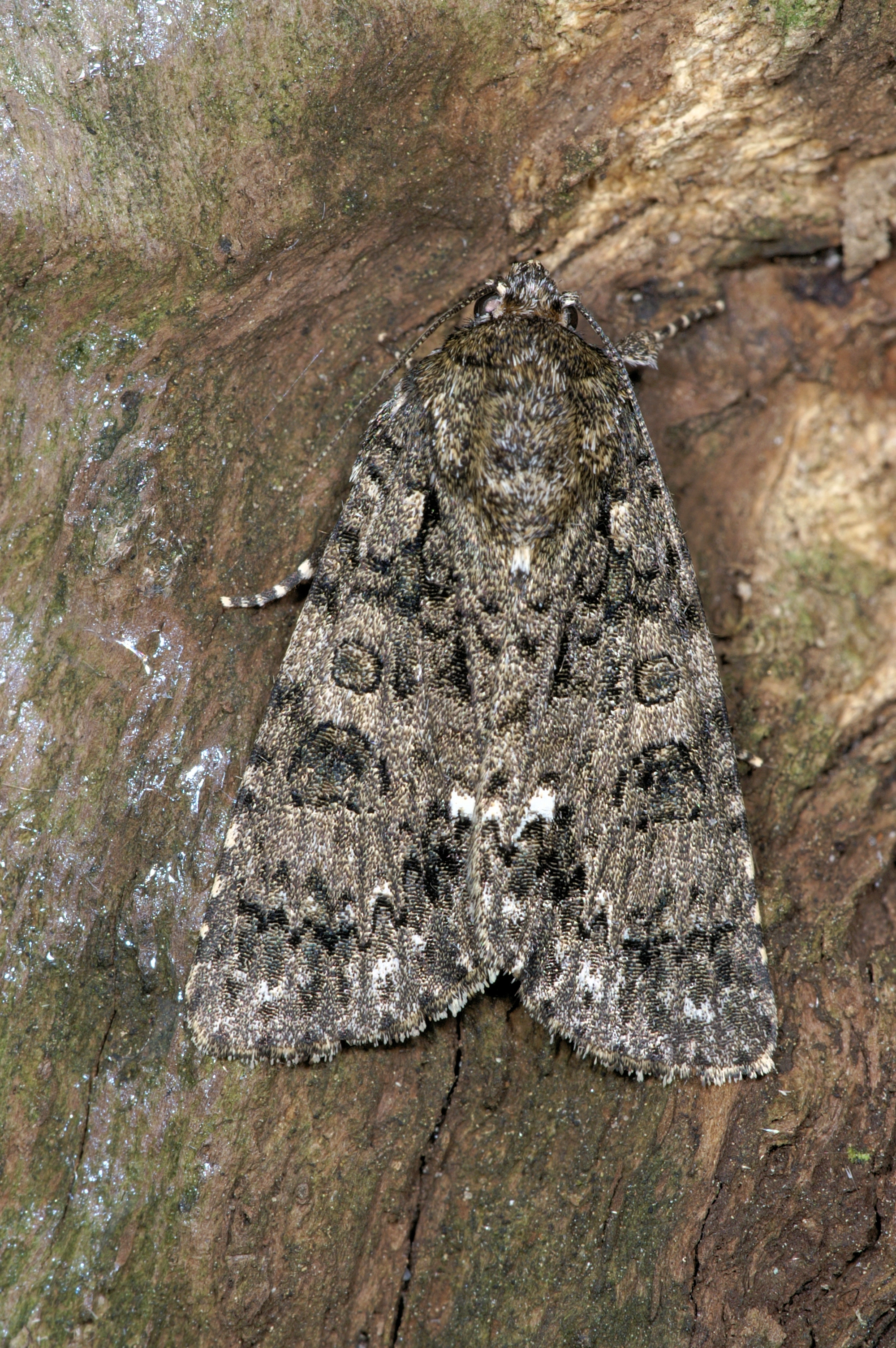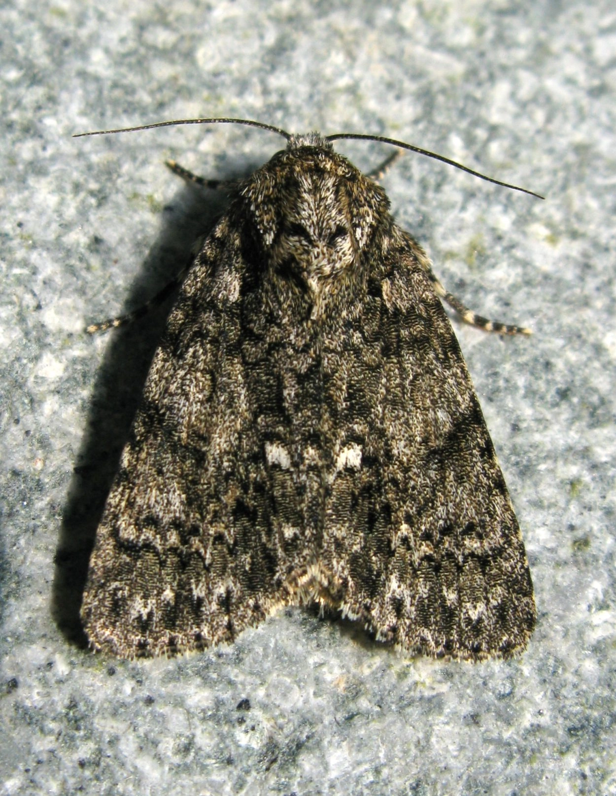 Voorvleugellengte: 16-20 mm. Deze Acronicta-soort heeft een vrij smalle grijze voorvleugel met een tamelijk grof uiterlijk. De vleugel is onregelmatig zwart bespikkeld en heeft een onduidelijke zwartachtige tekening. Karakteristiek is het opvallende krijtwitte vlekje langs de binnenrand, dat soms uit twee afzonderlijke vlekjes bestaat. De onderbroken golflijn is witachtig en valt meestal goed op. De hoeveelheid zwart is variabel. De achtervleugel is grijsachtig bruin.