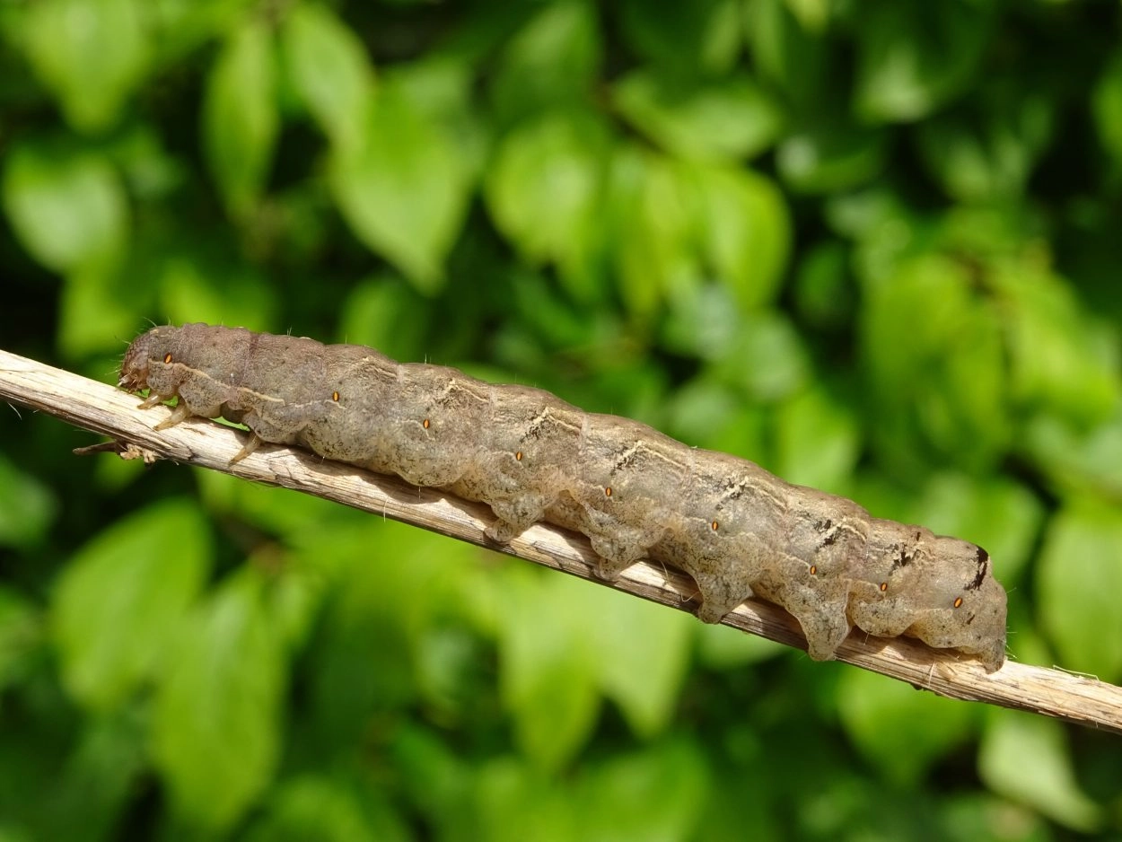 Tot 70 mm; vrij dik, naar de kop versmald; lichaam licht bruinachtig grijs of okerkleurig, met over de rug een witte, vlekkerige lengtestreep, die door een rij donkergrijze, driehoekige vlekken loopt en aan weerszijden een rij schuine, zwarte strepen heeft; onder de lijn van de zwartgerande, oranje spiracula loopt een okerachtig witte golflijn; kop lichtbruin met donkerder tekening.