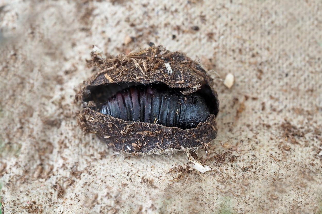 Tot 50 mm; overdekt met korte, fijne grijze haartjes; lichaam lichtgrijs met zeer fijne donkergrijze of zwarte stipjes; soms met een okerkleurige zweem op de rug; nek- en anaalschild op resp. segment een en dertien sterk roodachtig bruin getekend; kop lichtgrijs met zwarte vlekjes.