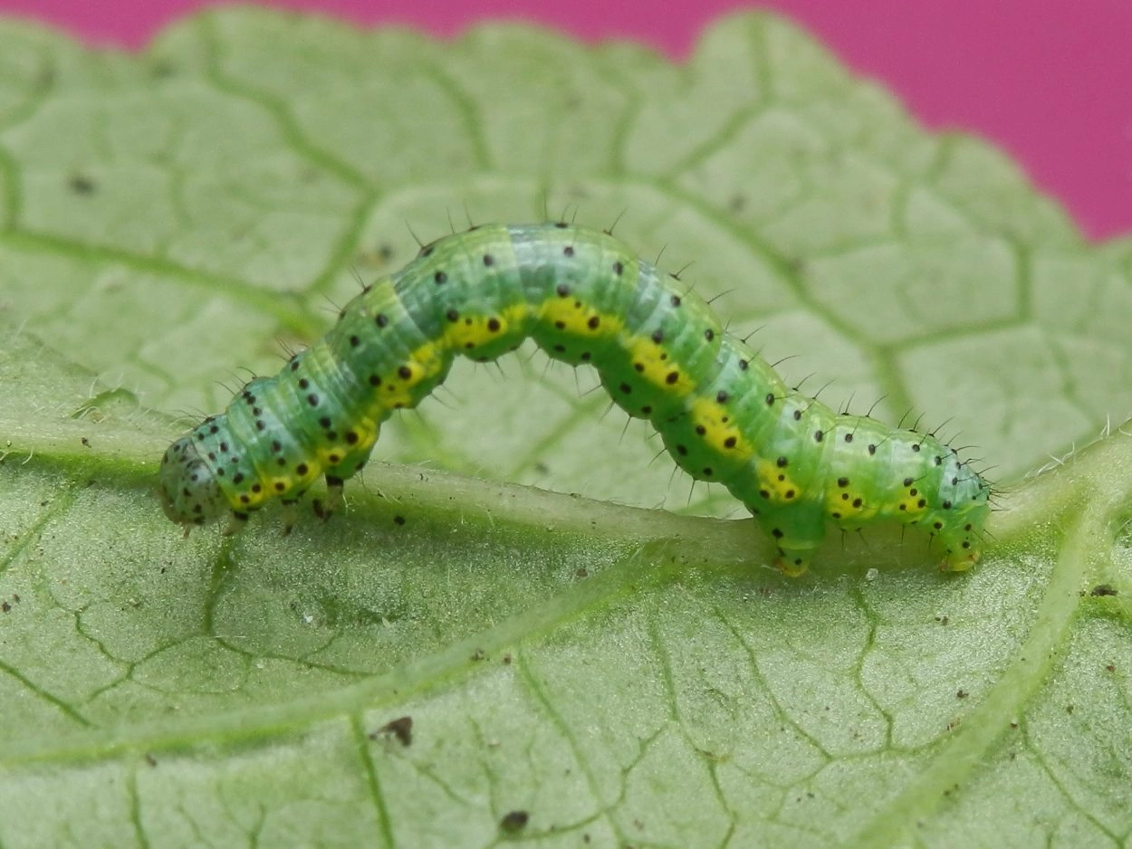 Tot 25 mm; lichaam groen of bruin met opvallende zwarte vlekken; over de rug vier witte of geelachtig witte, golvende lengtestrepen en een brede gele lengtestreep over de zwarte spiracula; kop groen of bruin met zwarte stipjes.