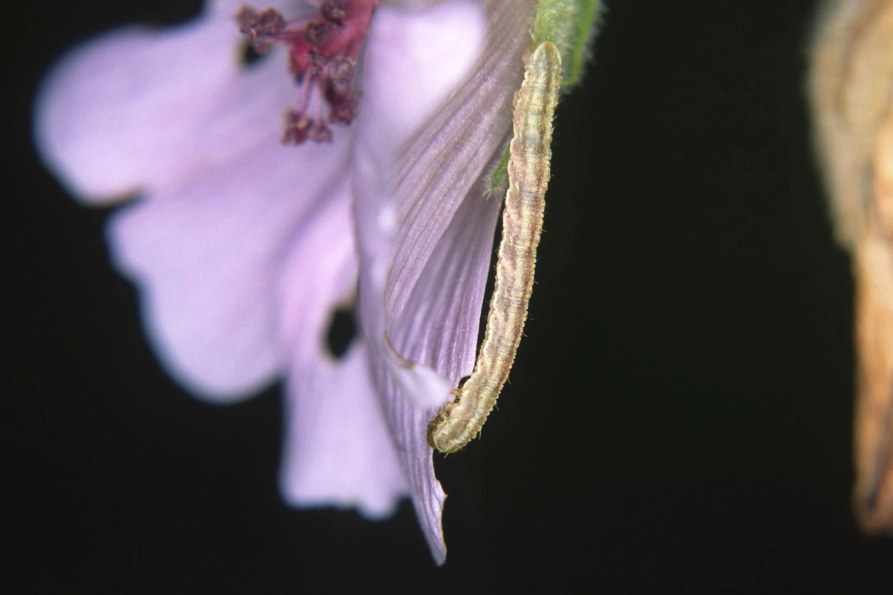 Tot 17 mm; zeer variabel, de grondkleur varieert van witachtig tot geelachtig groen, bruin, rood of purperachtig roze, gewoonlijk met over de rug een lichte middenstreep, waarin een rij donkere chevronvormige of driehoekige vlekken; kop geelachtig bruin.