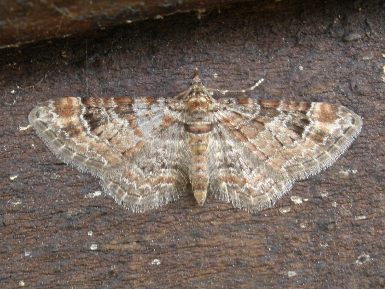 Voorvleugellengte: 8-10 mm. Een kleine spanner met vrij spitse vleugels; vlinders van latere generaties zijn vaak kleiner dan die van de eerste generatie. Sommige exemplaren hebben een opvallende roodachtige tekening langs de randen van de bruinachtige of witachtige voorvleugel, anderen zijn meer egaal roodachtig. Opvallend zijn de lichte, zwartgerande centrale dwarslijnen op de voorvleugel. Karakteristiek is dat het zwart van de buitenste dwarslijn, gerekend vanaf de voorrand van de vleugel, halverwege afzwakt en het patroon van een naar binnen wijzend kammetje heeft, dat zelfs bij sterk afgevlogen exemplaren vaak nog zichtbaar is. Sterk getekende vlinders hebben in de vleugelpunt vaak zwarte vlekken.