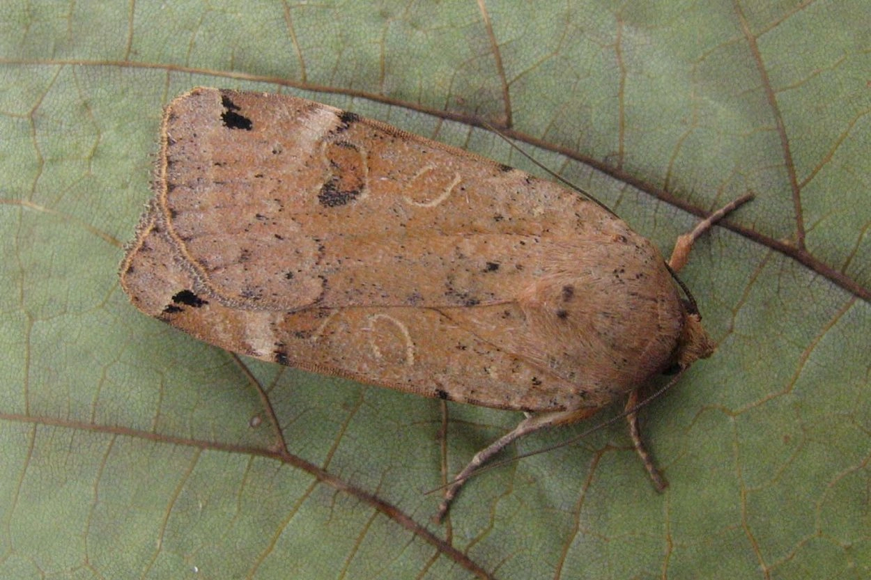 Voorvleugellengte: 17-20 mm. Deze uil heeft langs de voorrand van de vaak grijsachtig bruine, soms roodachtig getinte voorvleugel, een scherp begrensd zwart vlekje dicht bij de vleugelpunt. Op de oranjegele achtervleugel bevindt zich een donkere maanvormige middenvlek en langs de achterrand loopt een tamelijk smalle zwartachtige band. Vaak bevindt zich tegen de voorrand van de voorvleugel een klein donker vlekje net onder de niervlek, met net ernaast een wit tot lichtbruin vlekje.