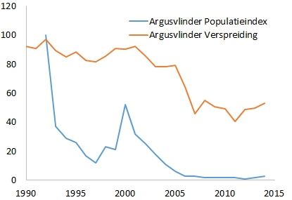 Het Meetnet Vlinders geeft dus populatietrends. Want al weten we de populatiegrootte niet precies, veranderingen in de populatiegrootte kunnen we wel prima volgen met het meetnet. Zo kunnen we sinds 1990 precies volgen hoe de argusvlinder achteruitging. De grafiek hierboven toont in één overzicht de beide trends van de argusvlinder in Nederland. Dan valt op dat de achteruitgang in de populatietrend al meteen te zien is, terwijl de verspreidingstrend pas vijftien jaar later reageert. Hoe kan dat? Als een soort achteruitgaat, dan begint dat met een daling van de aantallen. Het aantal plekken waar de vlinder leeft, de verspreidingstrend, verandert dan nog niet. Pas als de laatste vlinder op een bepaalde plek verdwijnt, reageert de verspreidingstrend. Het kan soms wel 15 jaar duren voordat de verspreidingstrend reageert.