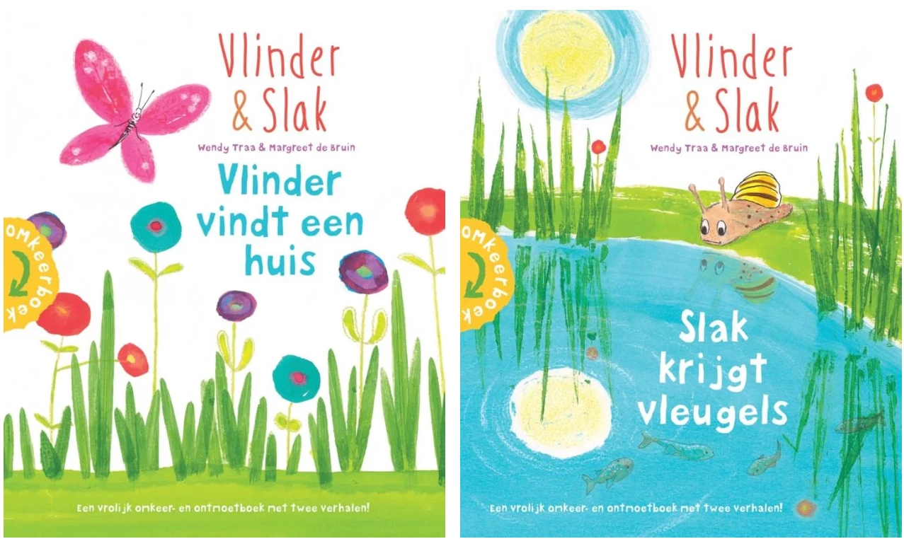 Een vrolijk omkeer- en ontmoetboek over vlindervleugels en slakkenkracht. Twee verhalen in één boek! Het inspireert kinderen elkaar te begrijpen en te helpen, tot rust te komen bij zichzelf, en hun hart te volgen. Lees het verhaal van Vlinder in 'Vlinder vindt een huis' en van Slak in 'Slak krijgt vleugels'. In het midden van het boek ontmoeten de verhalen elkaar...